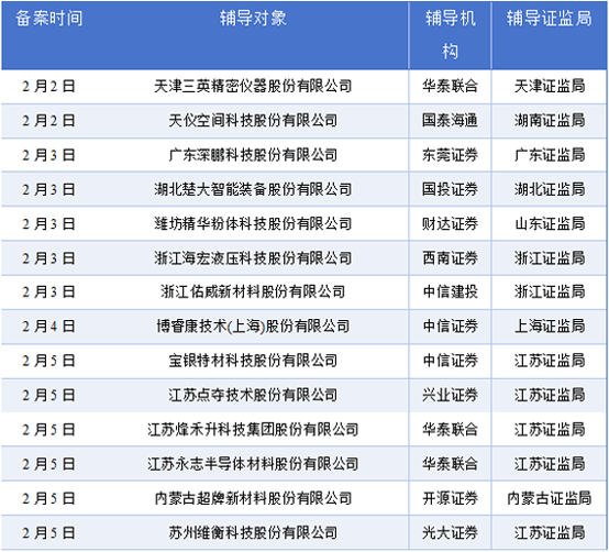 天津三英细密仪器股份无限公司的从停业务是高端X射线无损检测配备的出产、制制和发卖。公司的次要产物是X射线三维显微CT、X射线全岩心扫描仪、X射线平板物体显微CT。天仪空间科技股份无限公司是中国领先的SAR卫星星座运营商,专注于SAR星座扶植和SAR卫星数据办事。广东深鹏科技股份无限公司的从停业务曲直流无刷电子水泵的研发、出产和发卖。家用泵、工业泵、其他泵。湖北楚大智能配备股份无限公司的从停业务是供给玻璃成型设备、粉体物从动配料系统、基于机械人的产线智能化单位等环节配备及智能系统处理方案。公司的次要产物是玻璃成型设备、粉体物从动配料系统、基于机械人的产线智能化单位、配件。精髓粉体科技股份无限公司从营定制化超细粉体系体例备设备研发制制,系国度专精特新“小巨人”企业。浙江海宏液压科技股份无限公司的从停业务是液压动力机械及元件制制、发卖、维修。公司的次要产物是液压阀、阀体铸件、其他、其他营业。浙江佑威新材料股份无限公司的从停业务是复合材料成型用辅帮材料和布局芯材的研发、出产和发卖。公司的次要产物是实空袋膜、脱模布等实空辅材和轻木芯材、PET泡沫芯材等布局芯材。博睿康手艺(上海)股份无限公司的从停业务是处置脑-机接口系统相关设备的研发、出产、发卖以及手艺办事。宝银特材科技股份无限公司的从停业务是核电、航空航天、船舶、火电、石油化工、高速列车等范畴用特种管材研发、出产和发卖。公司的次要产物是核电用管、航空航天及船舶用管、火电用管、石油化工用管。江苏点夺手艺股份无限公司是一家工艺排气管道专业出产供应商及电子半导体工艺排气系统专业集成商,是江苏省高新手艺企业,从营特氟隆内衬风管(不锈钢焊接风管内衬特氟隆涂层)、不锈钢焊接风管、镀锌焊接风管等产物。江苏烽禾升科技集团股份无限公司是一家为新能源电池、汽车零部件、医疗器械等范畴的全球头部企业供给一流的数字化、柔性化智能制制出产处理方案及数据办事的高新手艺企业。江苏永志半导体材料股份无限公司的从停业务为半导体芯片封拆材料的研发、出产和发卖,次要产物包罗引线框架和封拆基板。超牌新材料股份无限公司的从停业务是煤矸石原料的研发、出产和发卖煤系煅烧高岭土及延长产物。公司的次要产物是超细煅烧高岭土、陶瓷釉用高岭土、偏高岭土、玻璃纤维用高岭土、其他新材料。姑苏维衡科技股份无限公司的从停业务是母排等电毗连产物和布局件的设想、研发、出产和发卖。公司的次要产物为母排以及布局件。2月2日至2月8日期间,安徽新富新能源科技股份无限公司、广东华汇智能配备股份无限公司、山东春景科技集团股份无限公司成功通过了审核流程。