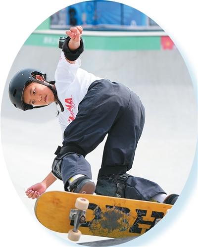 11月10日,13岁的广东队选手邹明珂获得第十五届全国活动会滑板女子碗池赛冠军。图为她正在角逐中。记者 刘 坤摄?。
