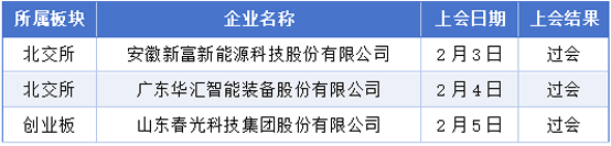 安徽新富新能源科技股份无限公司专注于新能源汽车热办理零部件的研发、出产和发卖,次要产物包罗电池液冷管、电池液冷板。跟着公司正在热办理范畴的堆集,公司前瞻性地开辟了电控系统散热器系列产物,该类产物将成为公司将来新的营业增加点。广东华汇智能配备股份无限公司是一家专业处置高端智能配备及其环节部件的研发、设想、出产和发卖的高新手艺企业,努力于成为全球一流的智能配备制制商。公司颠末 15 年的成长,逐渐构成了细密机械部件、锂电智能配备和数控机床智能配备的产物系统。山东春景科技集团股份无限公司努力于打制世界一流的磁电专业制制商,构成以磁性材料为支持,以磁性元器件为纽带,以电源手艺为引领,各财产板块互相支持、错位成长,沉点结构磁性材料和电源的财产链成长模式。公司从停业务为软磁铁氧体磁粉的研发、出产和发卖,并沿财产链成长软磁铁氧体磁心、2月2日至2月8日期间,芜湖埃泰克汽车电子股份无限公司、杭州高特电子设备股份无限公司取得了注册批文。